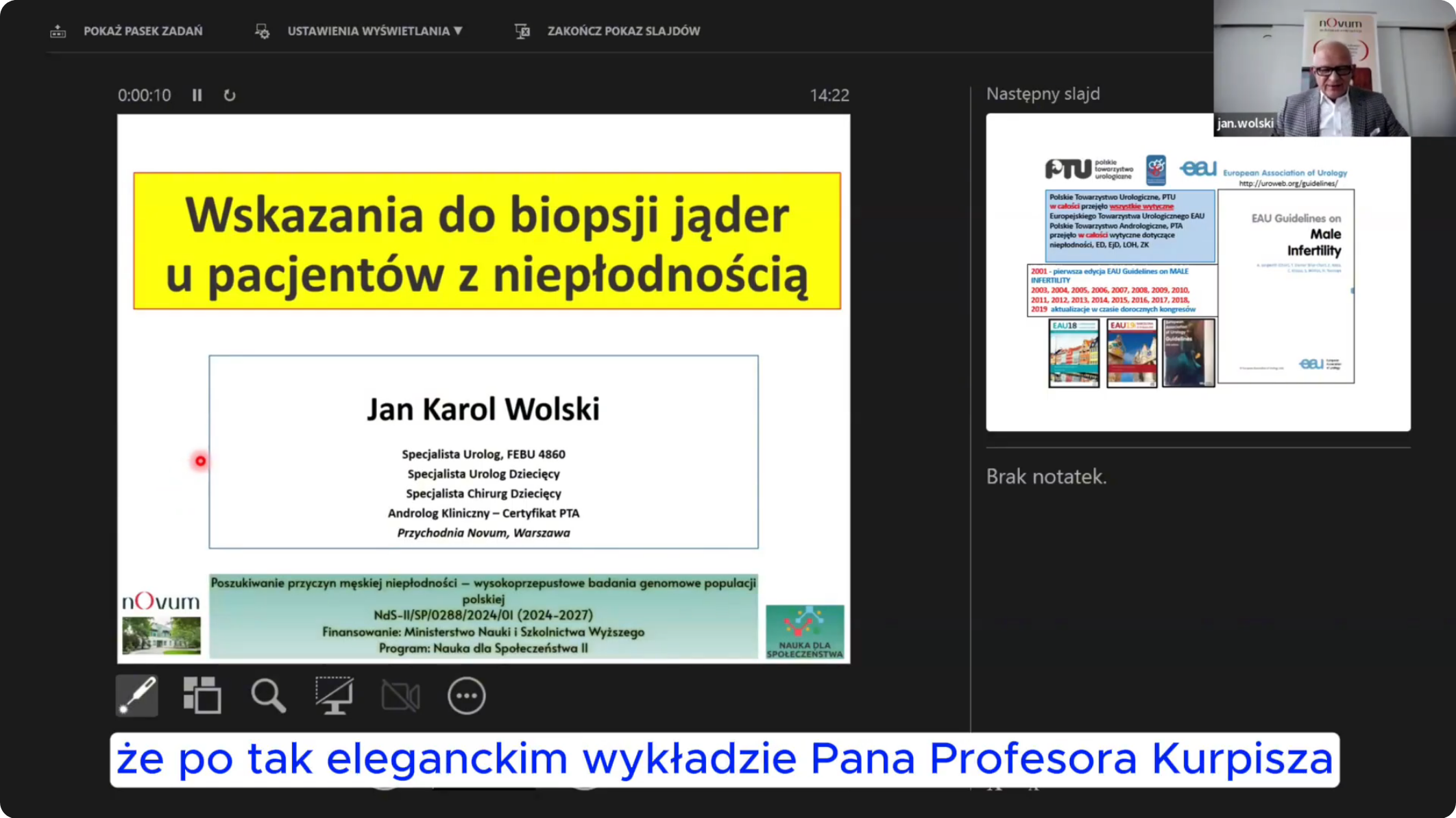 Dr J.K. Wolski wygłosił dwa wykłady obejmujące: „Rezonans magnetyczny w diagnostyce andrologicznej”, J.K. Wolski, M. Zagrodzka oraz „Szansa na pozyskanie plemników w biopsji jąder TESA i m-TESE u mężczyzn z azoospermią po leczeniu onkologicznym”, J.K. Wolski, G. Kapuściński, K. Kozioł, D. Starczewski, B. Biarda, M. Kołacz, K. Gawron, K. Korczyńska, A. Strzałkowska, B. Sierakowski, M. Wideński, J. Judycki, J. Ostrowska, A. Sobczyńska-Tomaszewska, J. Lewandowski, P. Lewandowski